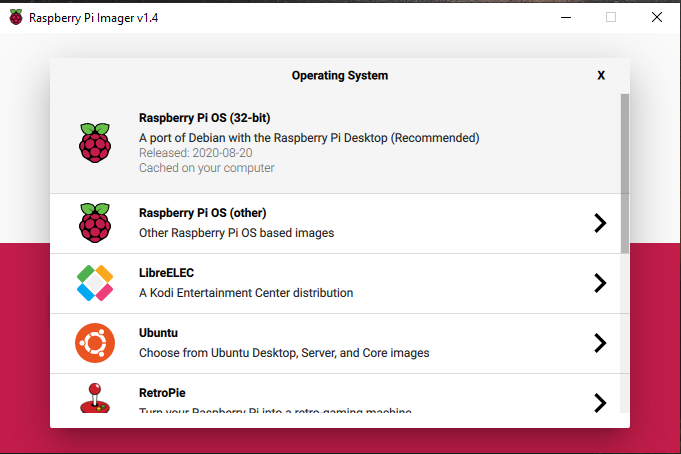 이와 같은 화면을 볼 수 있다. 여러 가지가 있어서 복잡하겠지만 일반적인 라즈베리파이를 실행할 것이므로 맨 위의